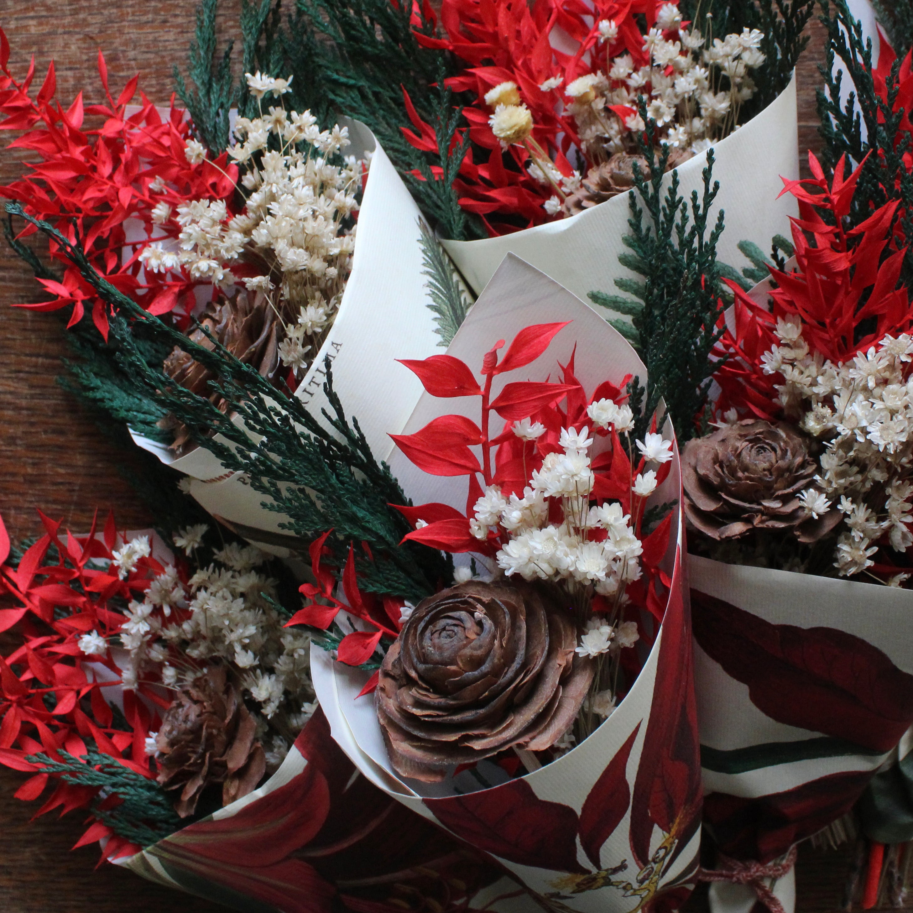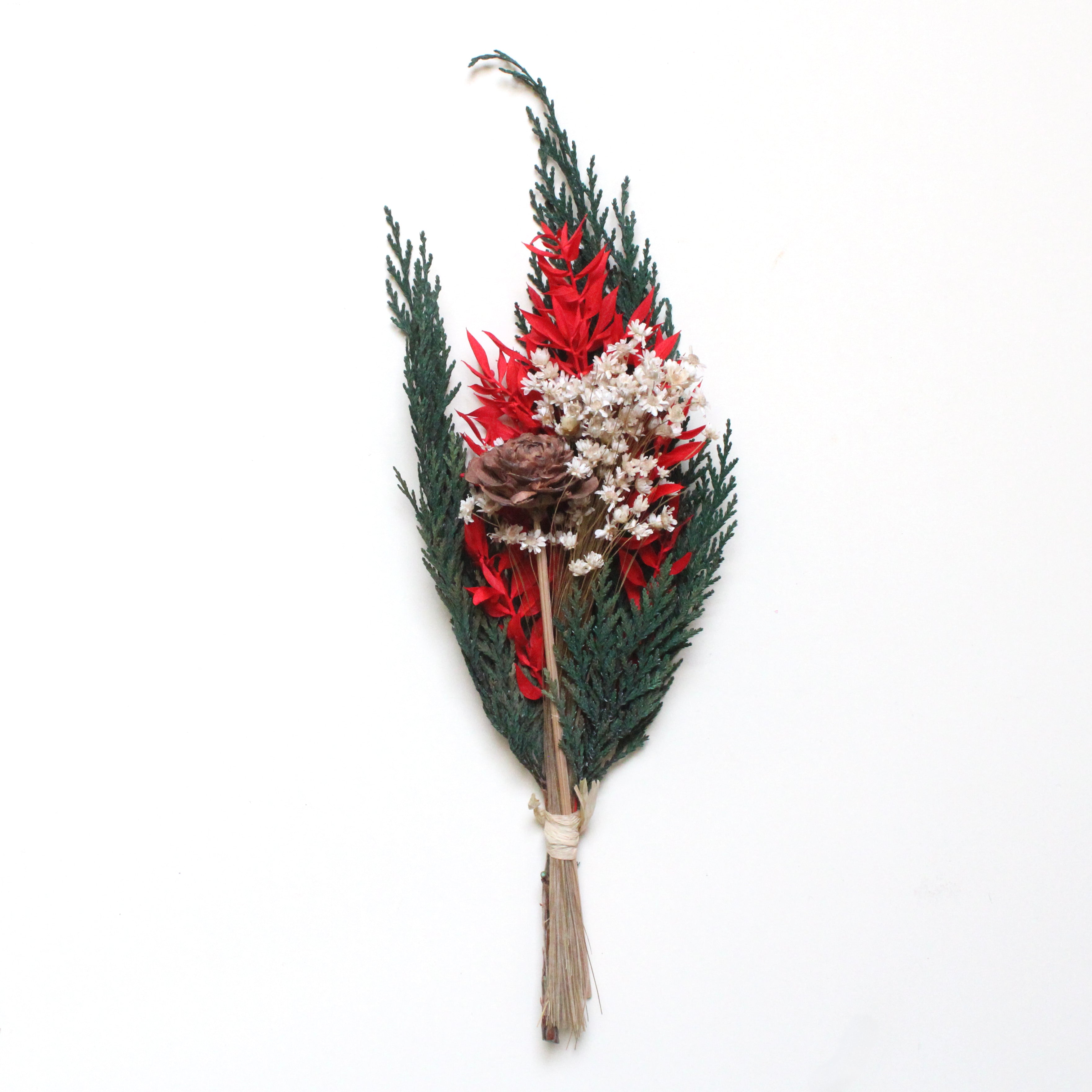 Be Merry Bouquet features cedar, cedar rose, star flower, and ruscus..