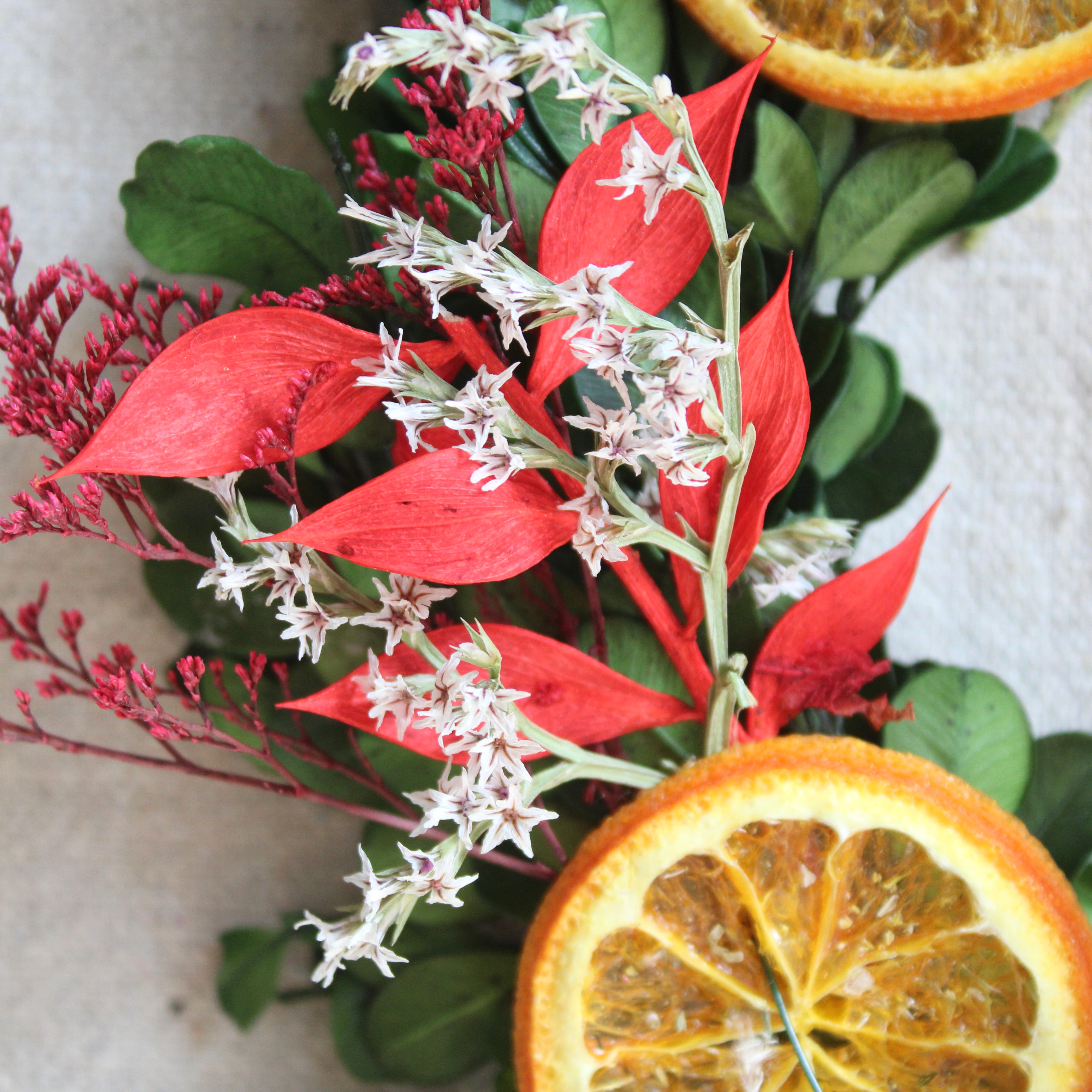 Festive Fruit Wreath features preserved boxwood, orange slices, German statice, ruscus, and ribbon.