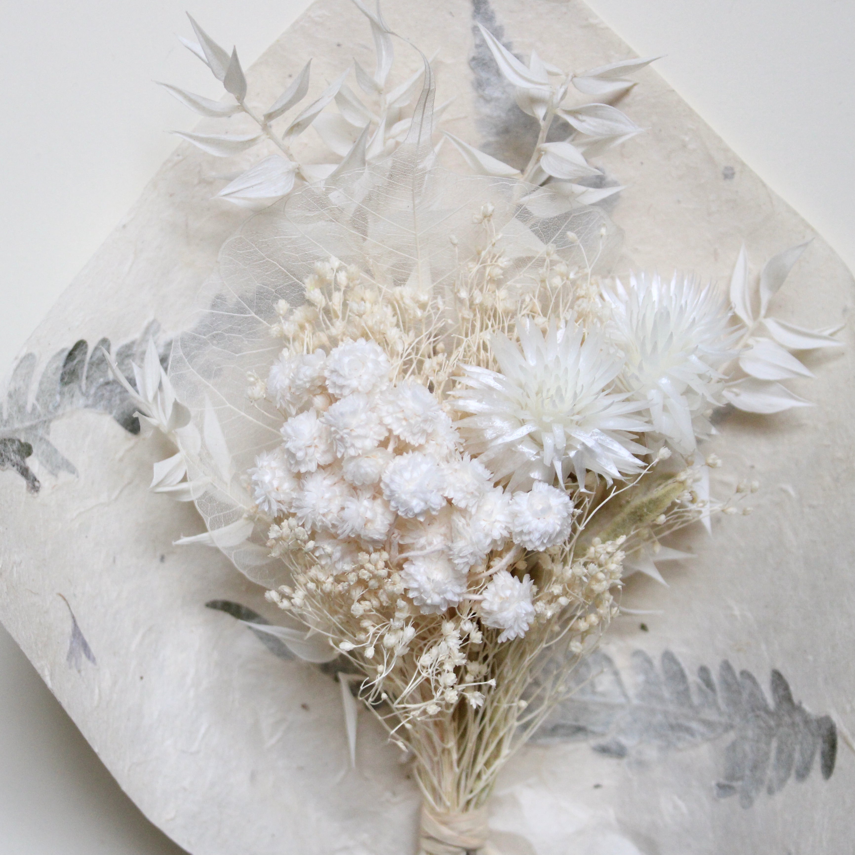 Frosted Fern Bouquet features broom bloom, everlasting, ruscus, skeleton leaf, and immortelle.