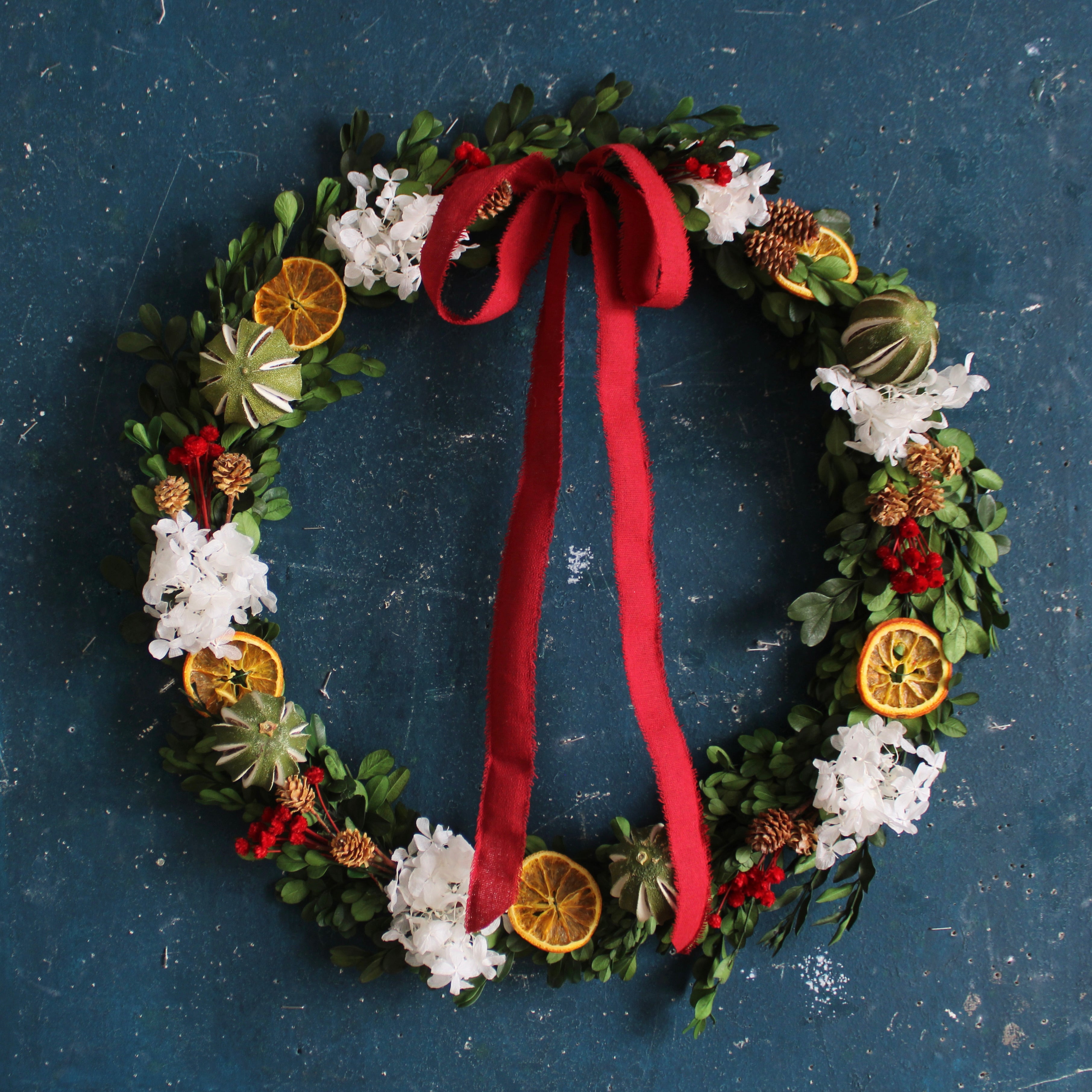 Season's Greetings Wreath features boxwood, orange slice, hydrangea, happy flower, lime, and salignum pod.