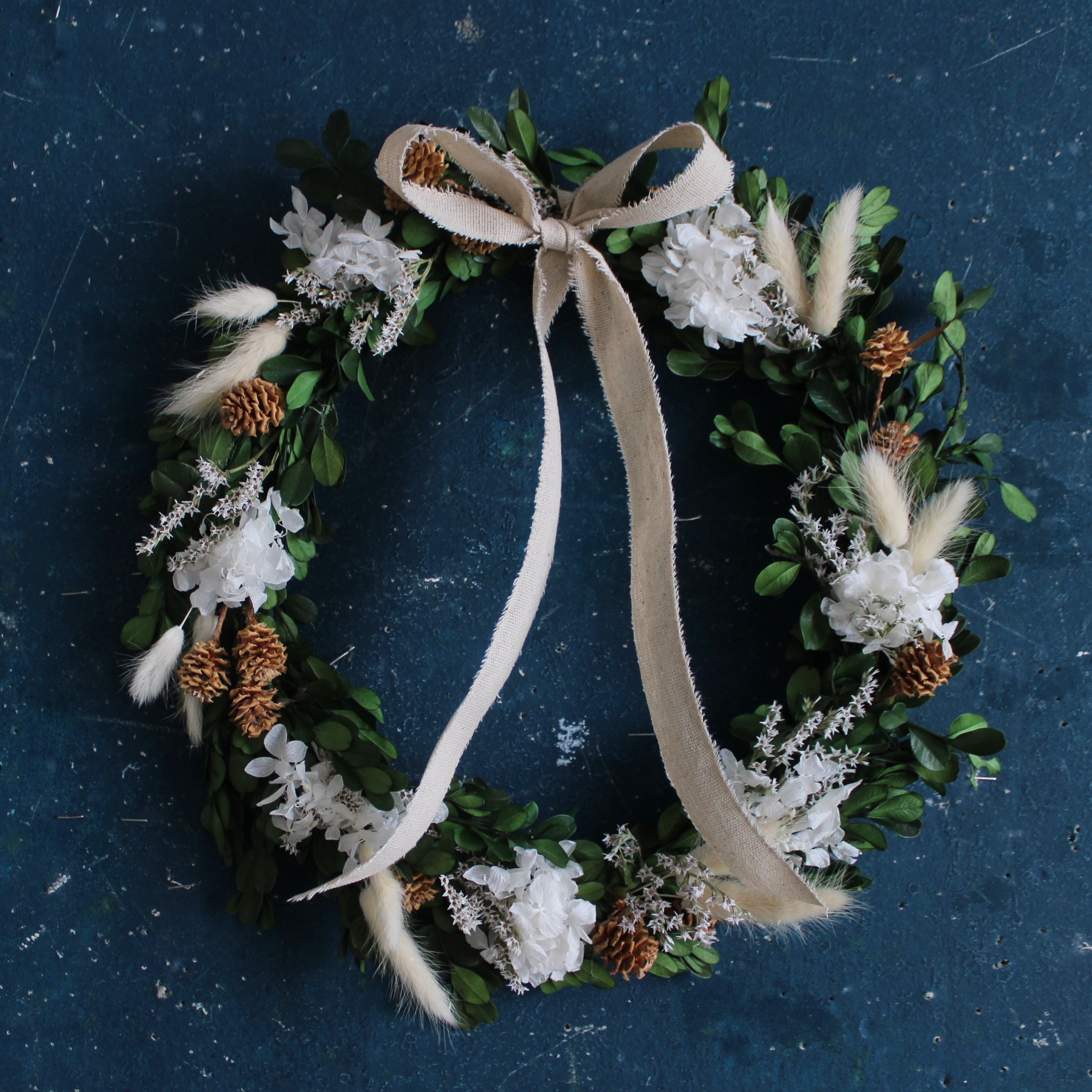 Upstate Holiday Wreath features boxwood, hydrangea, bunny tail, German statice, and salignum pod.