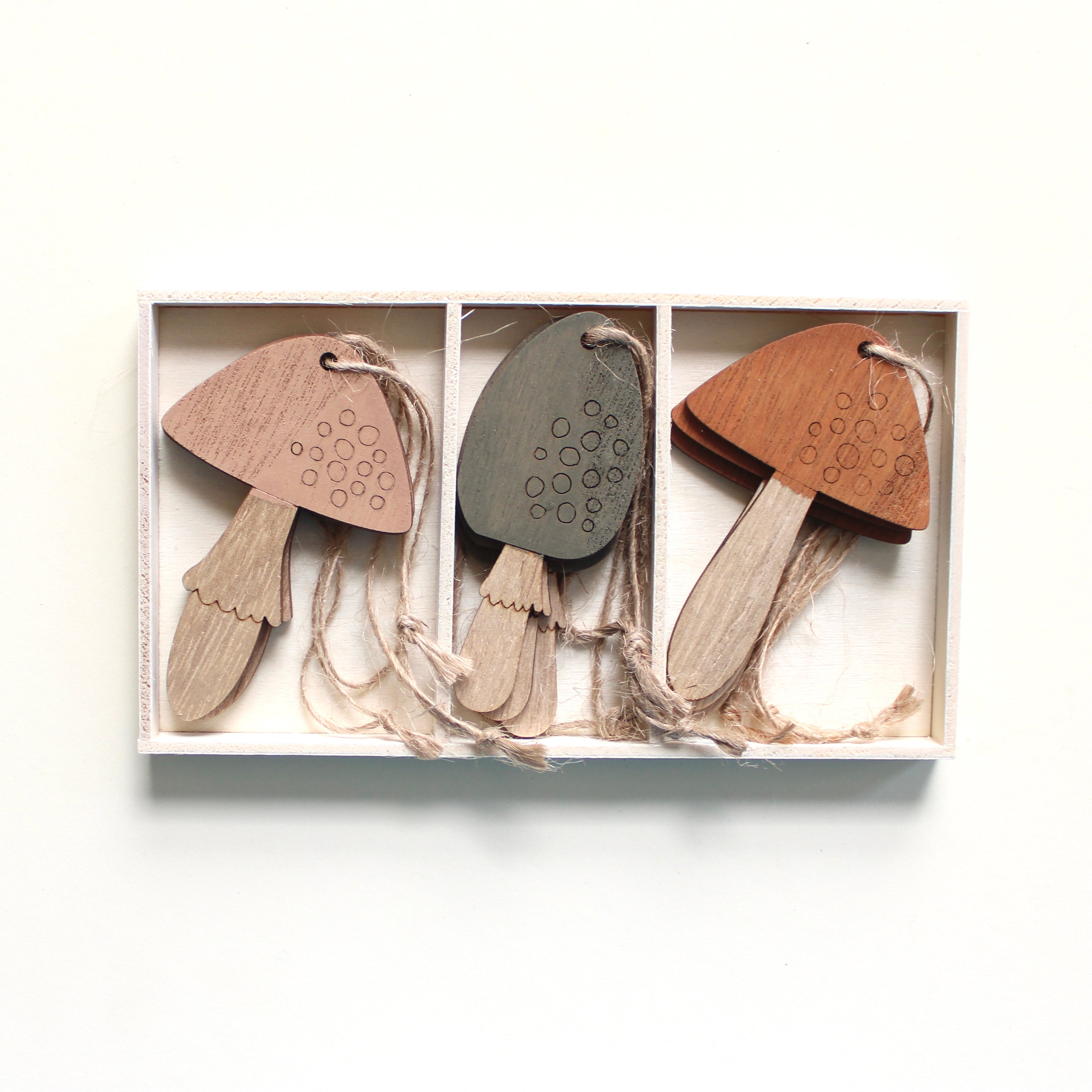 Fantastic fungi for your holiday tree! This mushroom collection includes 9 ornaments featuring 3 different designs.